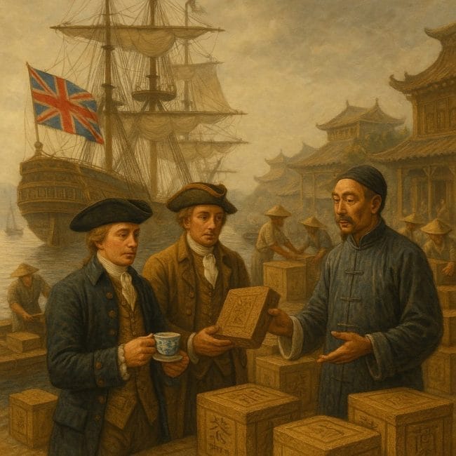 中国との茶取引の開始 – オランダが独占していた中国茶取引にも、イギリスは17世紀後半から本格的に乗り出します。イギリス東インド会社はまず1664年に中国茶100ポンドを試験的に発注・輸入し 、これがイギリス初の公式な茶取引となりました。その後、1684年に清朝が海禁を解き広州貿易を許可すると、EICは1690年代から中国との直接貿易を開始します。1699年(または1697年頃)には初の自前の商船を中国に派遣して茶の直接買い付けを実現しました。そして1704年以降、広州に定期的に商館(ファクトリー)を設置して毎年茶を大量に購入する体制を整えます 。1713年までに広州での通商権を確立したイギリスは、以後18世紀を通じて中国茶の最大の取引国となりました 。