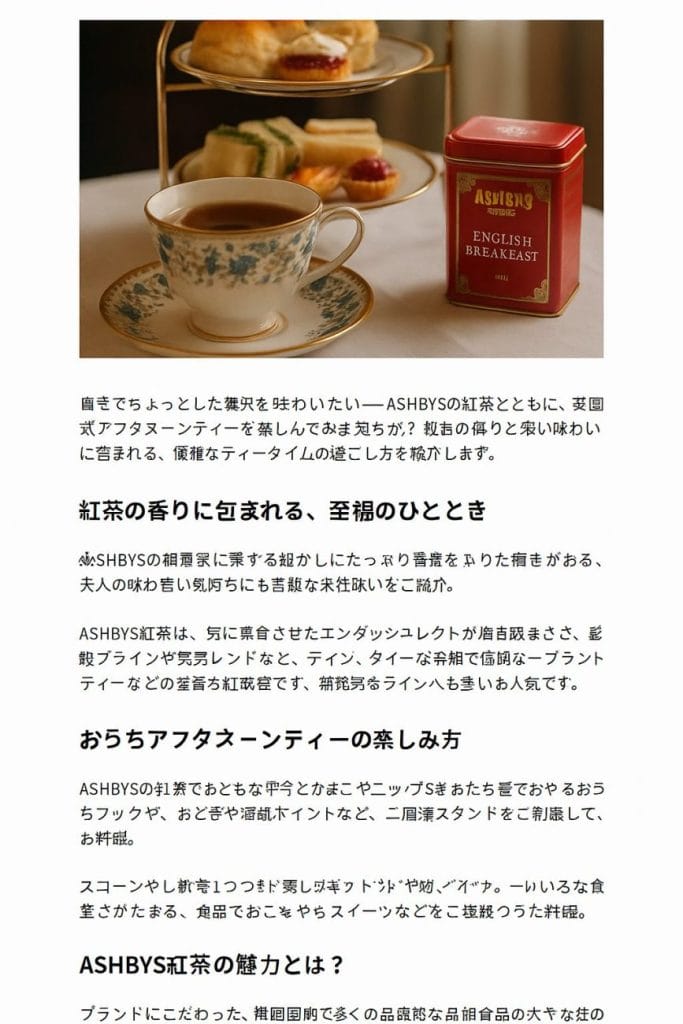 本場の味わいを、自宅で気軽に──ASHBYSで楽しむアフタヌーンティーの世界 紅茶の本場、イギリス。午後の優雅なひとときを演出するアフタヌーンティーは、いまや世界中の紅茶好きの憧れの文化です。そんな本格的な英国スタイルを、自宅でも気軽に楽しめると... -